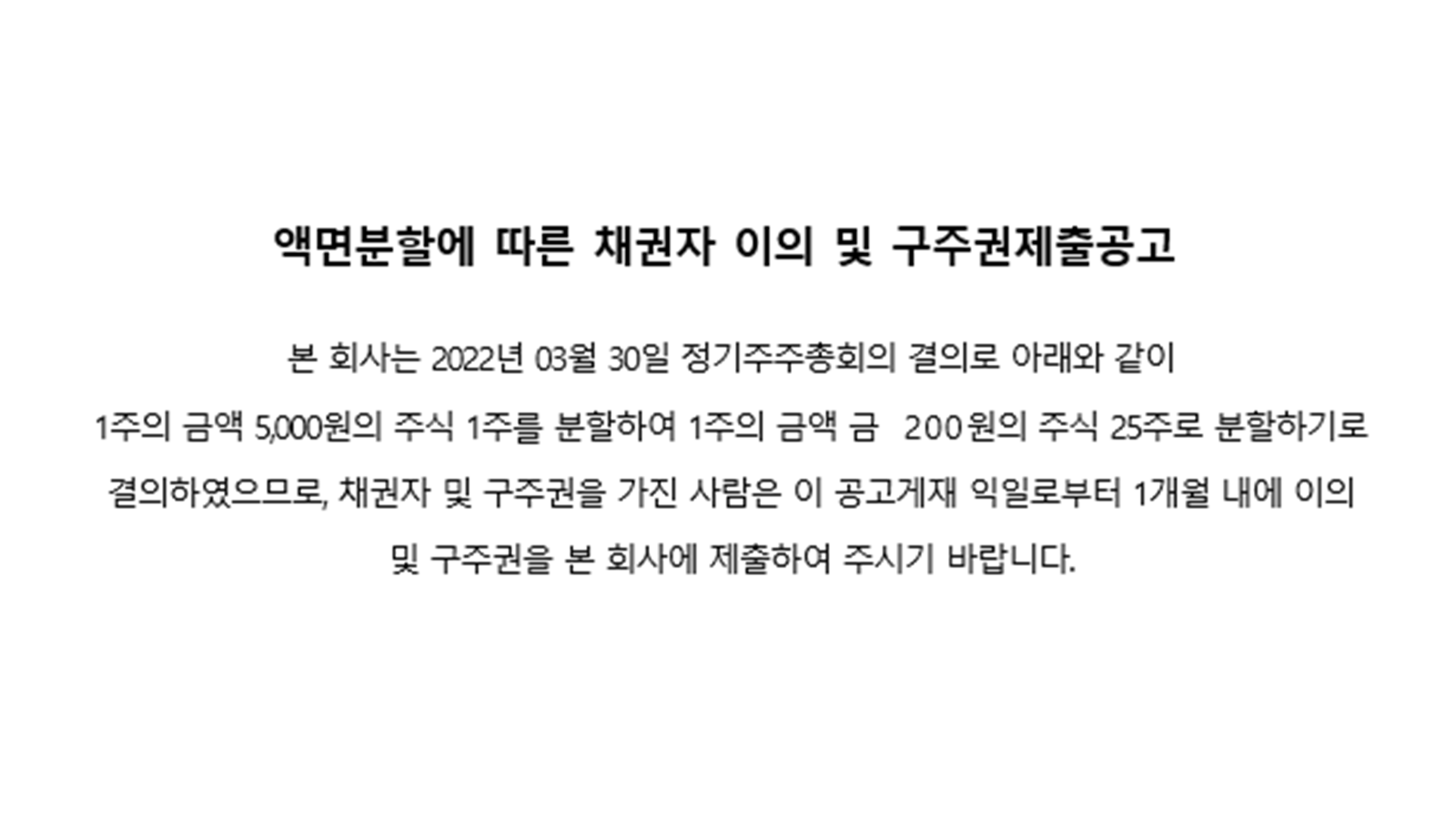 [액면분할에 따른 채권자 이의 및 구주권 제출공고]